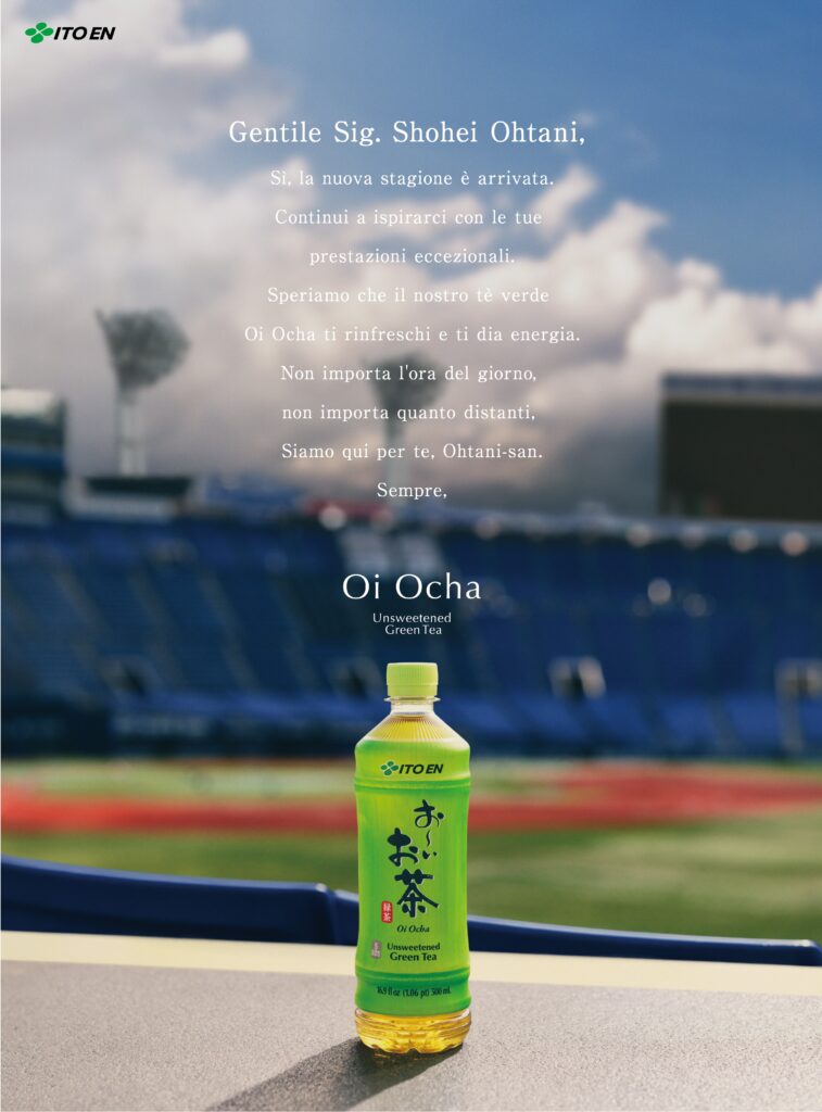 L’annuncio della partnership è stato accompagnato da una lettera aperta da parte di ITO EN, pubblicata in oltre 60 quotidiani in tutto il mondo. Questo gesto è un messaggio di sostegno diretto a Ohtani nella sua nuova avventura con i Los Angeles Dodgers. Non solo. ITO EN si impegna a sostenere Ohtani sia fornendo i prodotti della partnership, sia offrendo il proprio sostegno in qualsiasi momento e in qualsiasi luogo, sia all’atleta stesso che ai suoi cari, dalla famiglia agli amici e collaboratori.